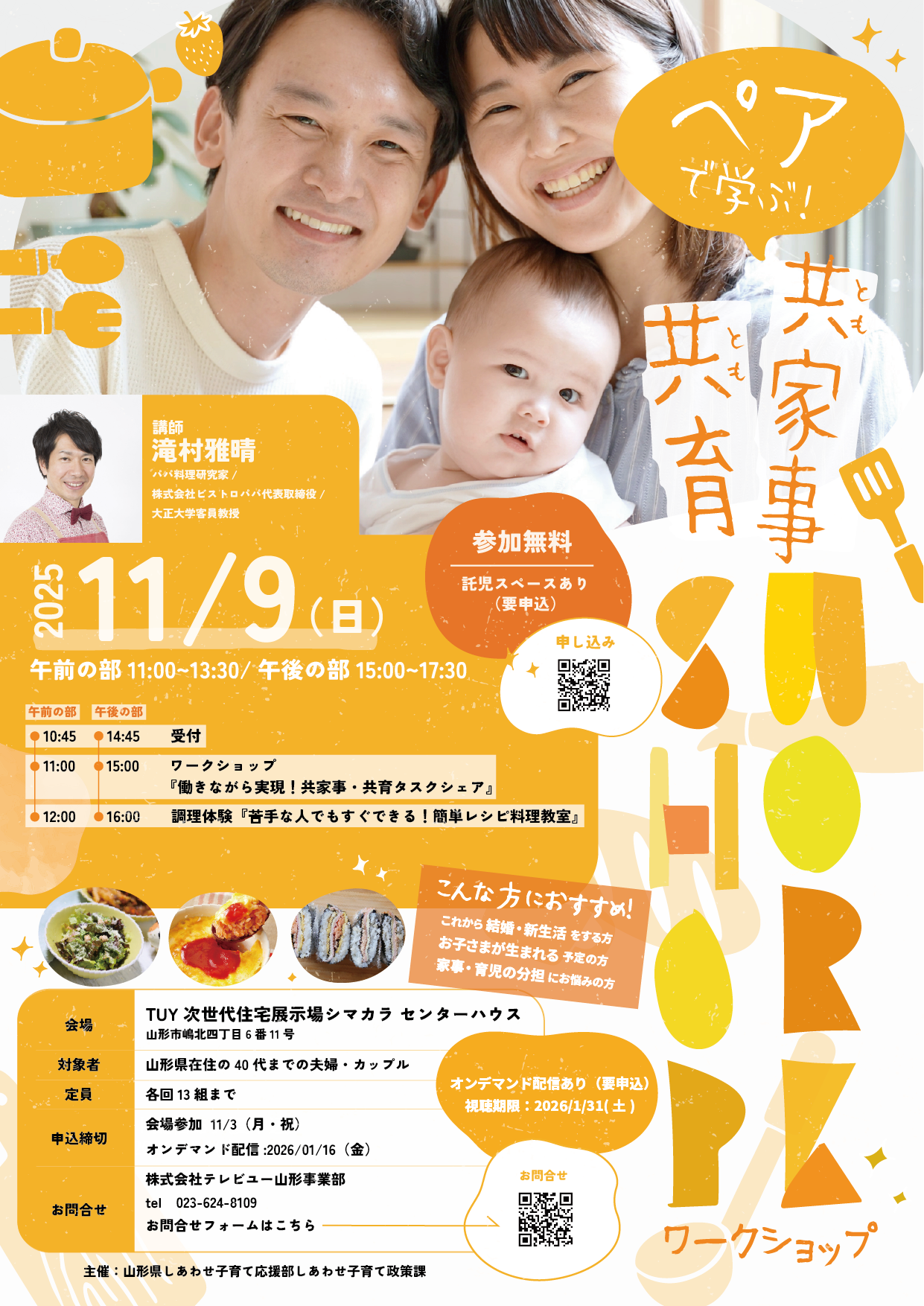 県では、夫婦が共に家事・育児をする共家事・共育を応援するため、家事・育児の「見える化」や、家事・育児の一例として、料理をテーマに簡単レシピの調理体験など内容盛りだくさんのワークショップを開催します!