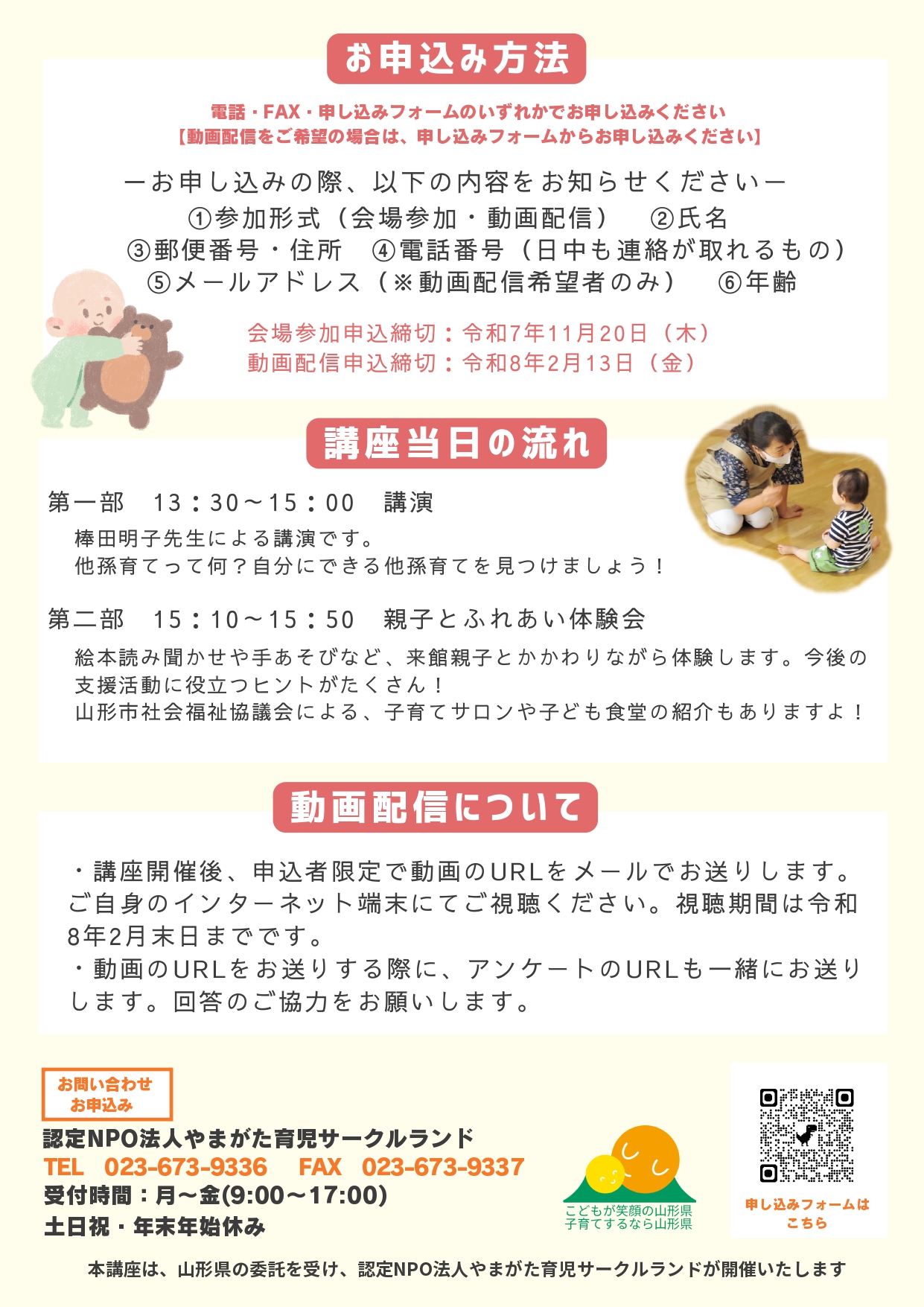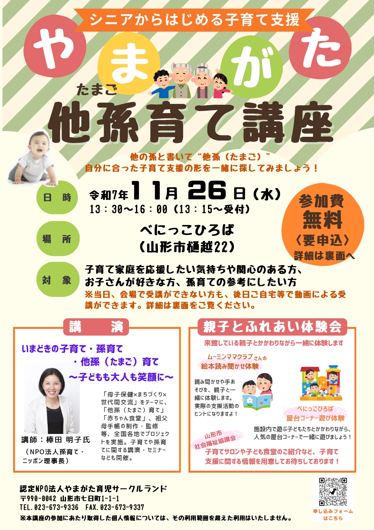 活力や意欲のあるシニア世代を対象に、子育て家庭を取り巻く環境や、こどもや親子との接し方など、子育て支援活動やご自身の孫育てに役立つ内容を学ぶことができる講座<やまがた他孫(たまご)育て講座>を開催します。