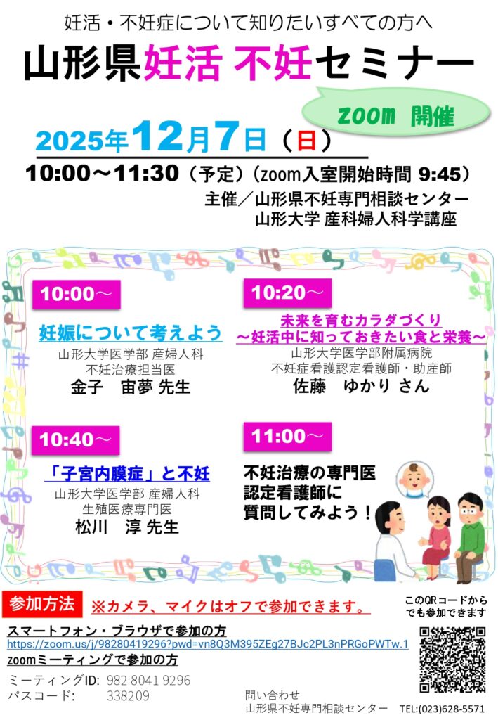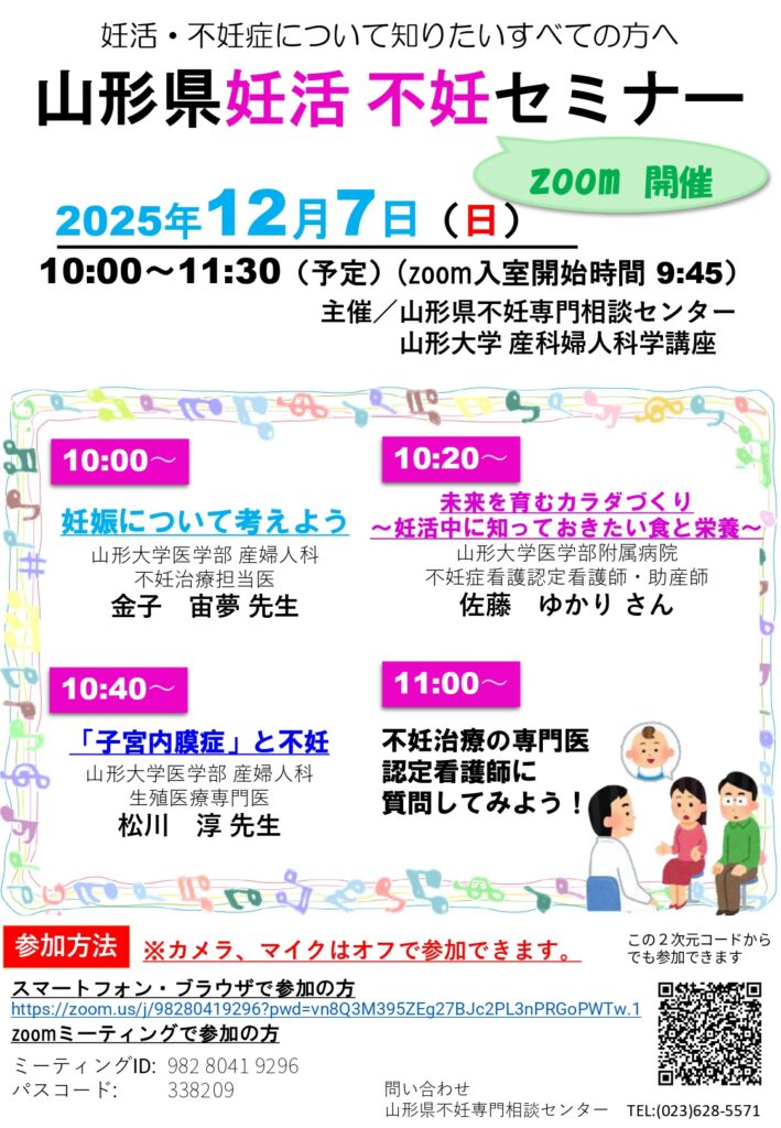 このたび、妊活や不妊症をテーマに、県民の方向けの「山形県妊活不妊セミナー」をオンライン(Zoom)で開催いたします。(今年度2回目の開催)